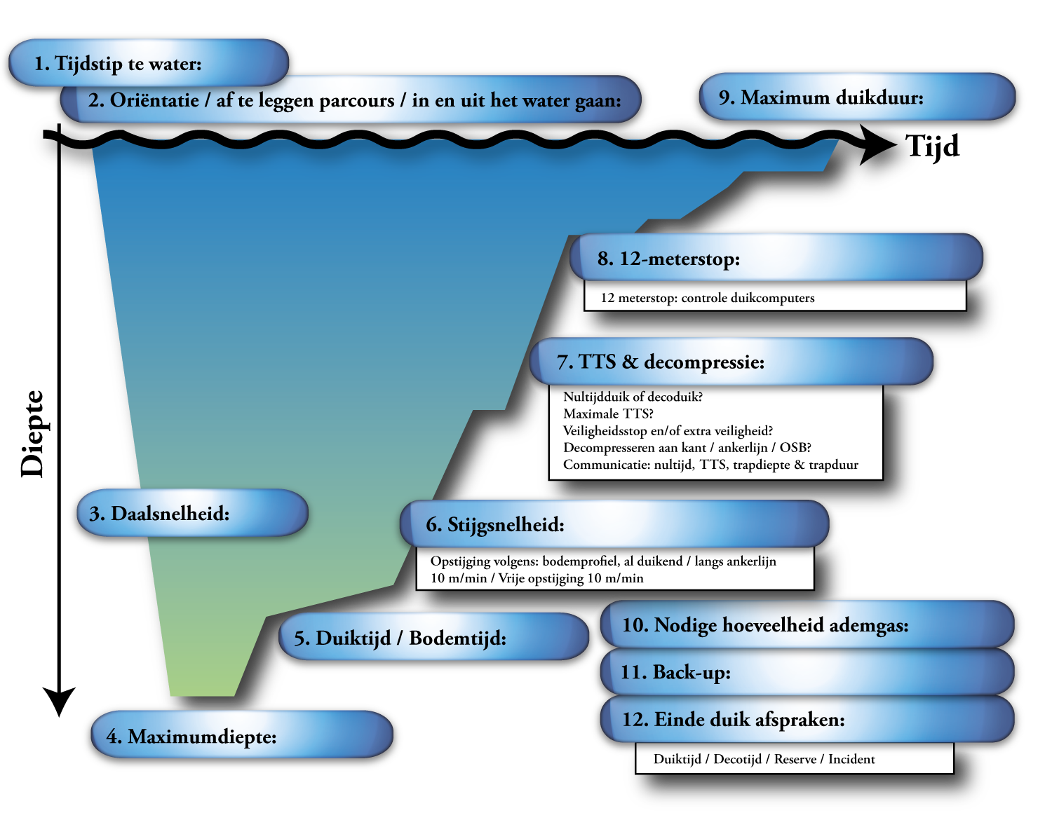 Controleer brevet, ervaring, laatste duik en eventuele problemen.